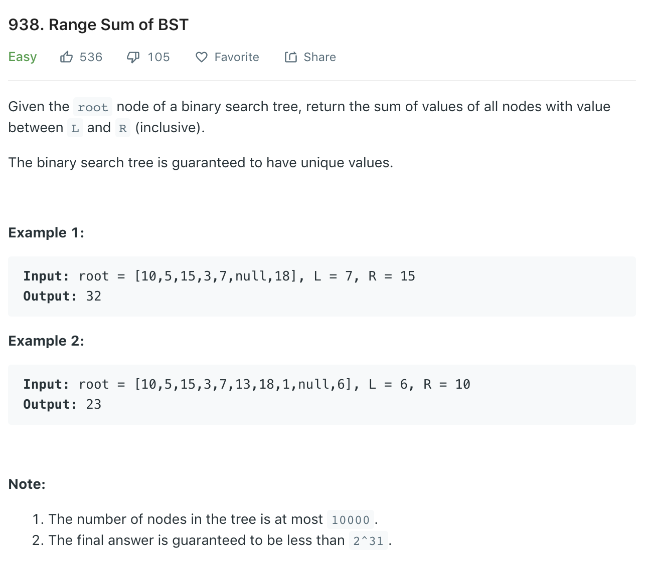 Input: root = [10,5,15,3,7,null,18], L = 7, R = 15 Output: 32