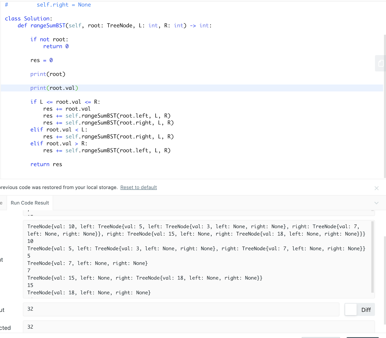 Given the root node of a binary search tree, return the sum of values of all nodes with value between L and R (inclusive).