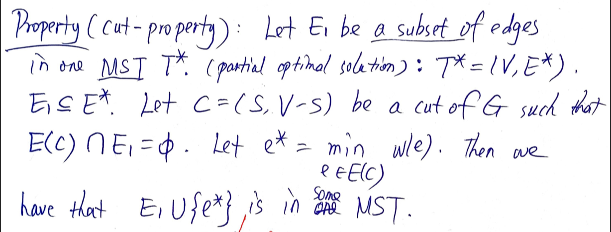 하나의 set 에서 다른 셋으로 이어주는 edge 가 min weight 는 MST에 속한다는 것이다