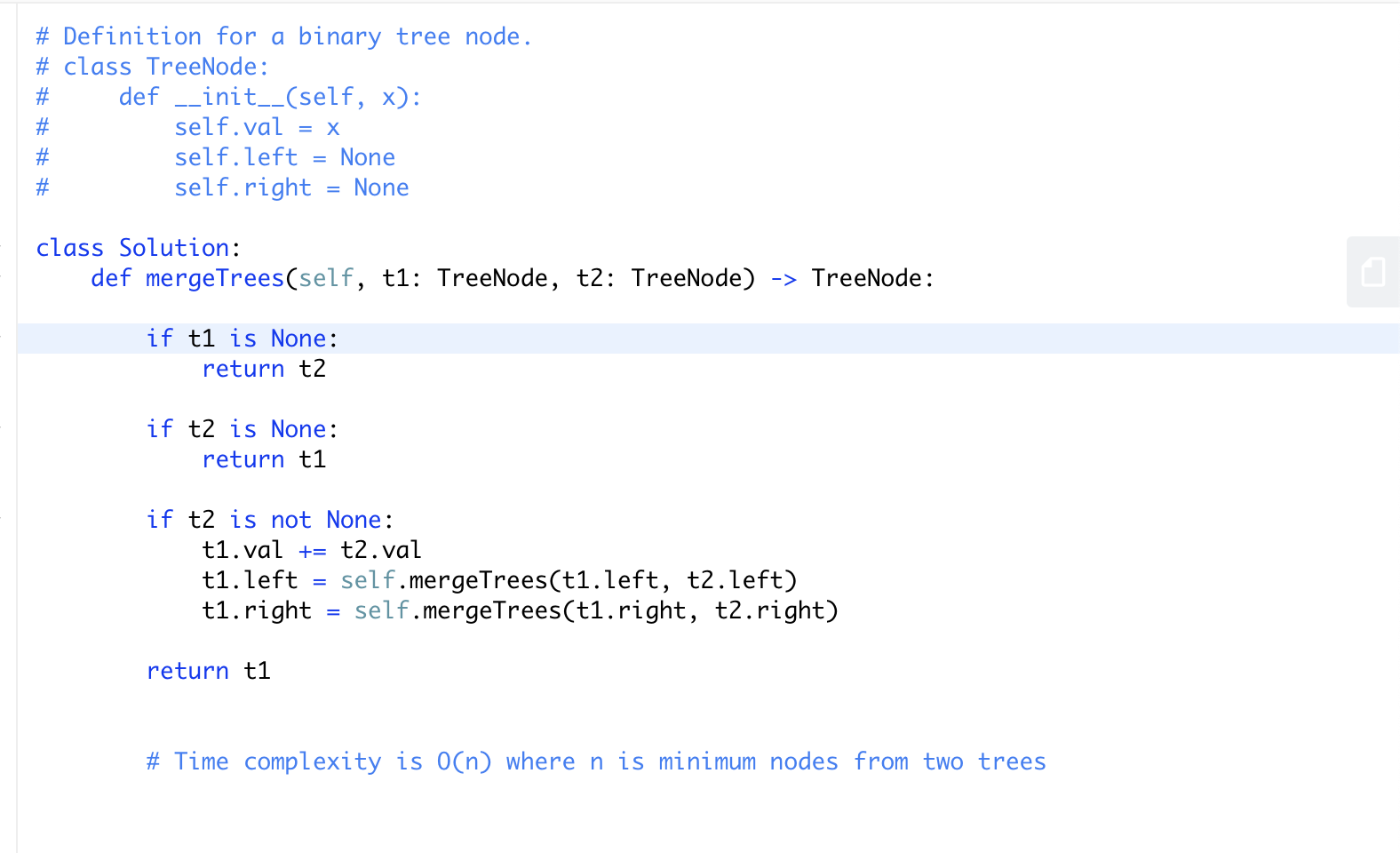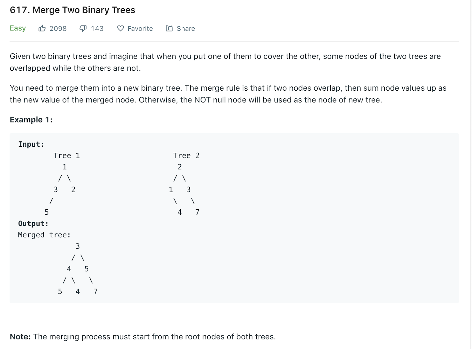 You need to merge them into a new binary tree. The merge rule is that if two nodes overlap, then sum node values up as the new value of the merged node. Otherwise, the NOT null node will be used as the node of new tree.