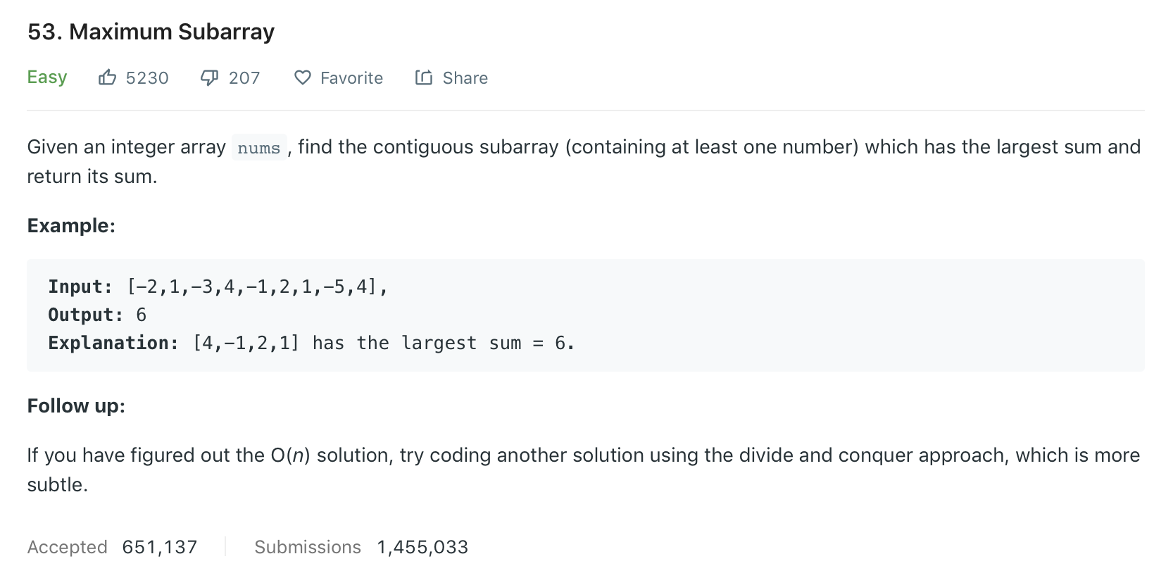 Input: [-2,1,-3,4,-1,2,1,-5,4], Output: 6 Explanation: [4,-1,2,1] has the largest sum = 6.