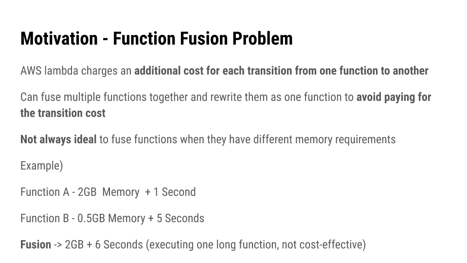 In this case, there is also an additional cost for each transition from one to another. If we want to remove this additional cost, we can just fuse multiple functions like combining them as one function to avoid paying transition costs. However, this is not ideal if functions have different memory configurations. For example, If A function has 2GB memory 1-second duration and B function has 0.5 memory and 5-second duration, If we fuse them then, the combined function will be executed for 6 seconds with memory set as 6 seconds. This isn’t cost-effective because the B lambda function could just have been executed for 5 seconds with just 0.5GB memory. This related-problem is called function fusion problem