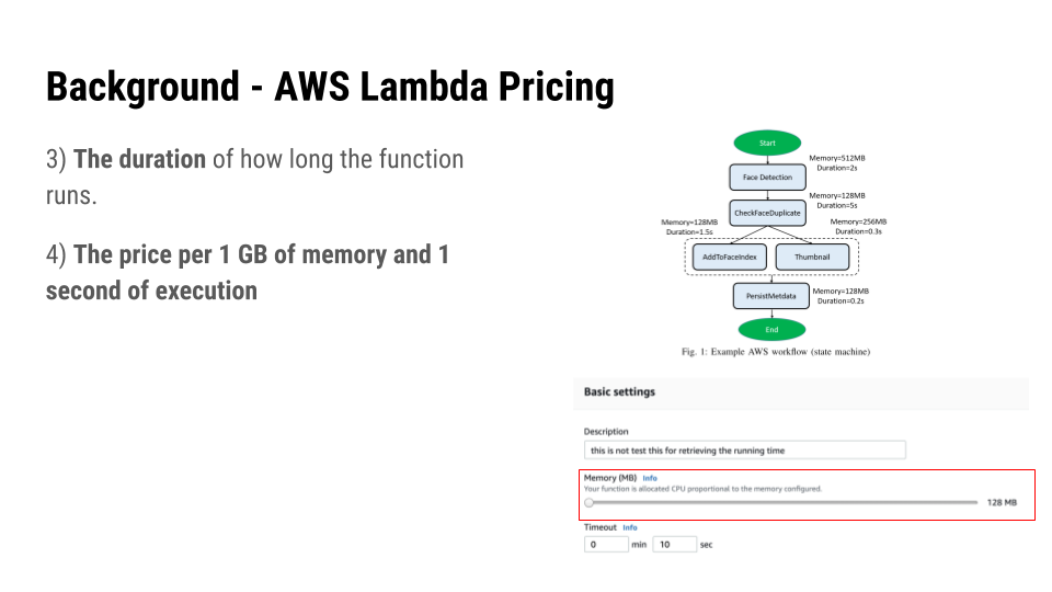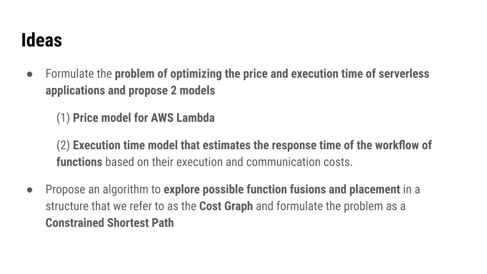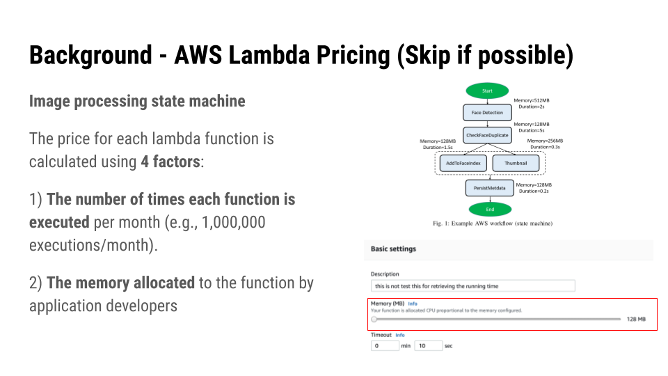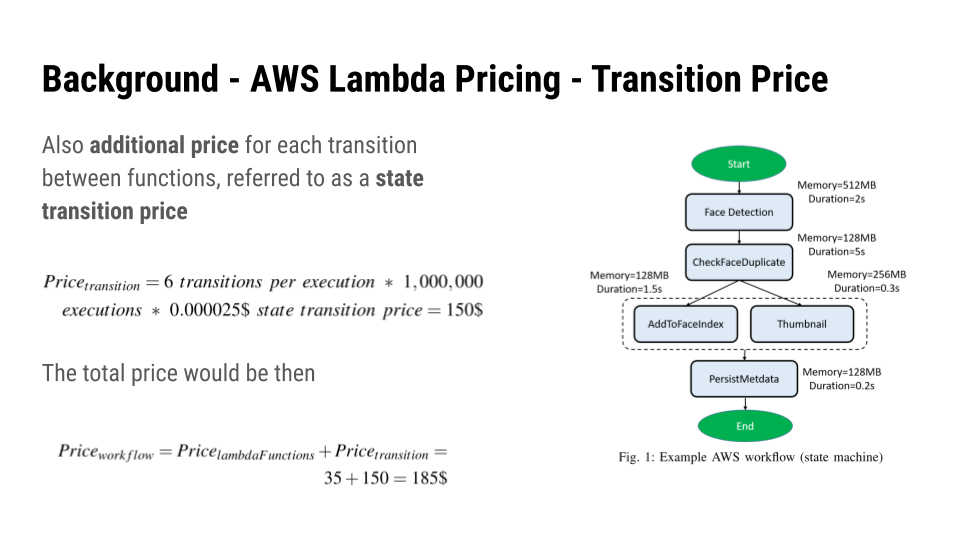 The idea this paper proposes is first formulating the problem of optimizing the price and execution time as 2 models. First is the price model for AWS Lambda, and execution time model for workflow functions based on the functions costs and transition costs.