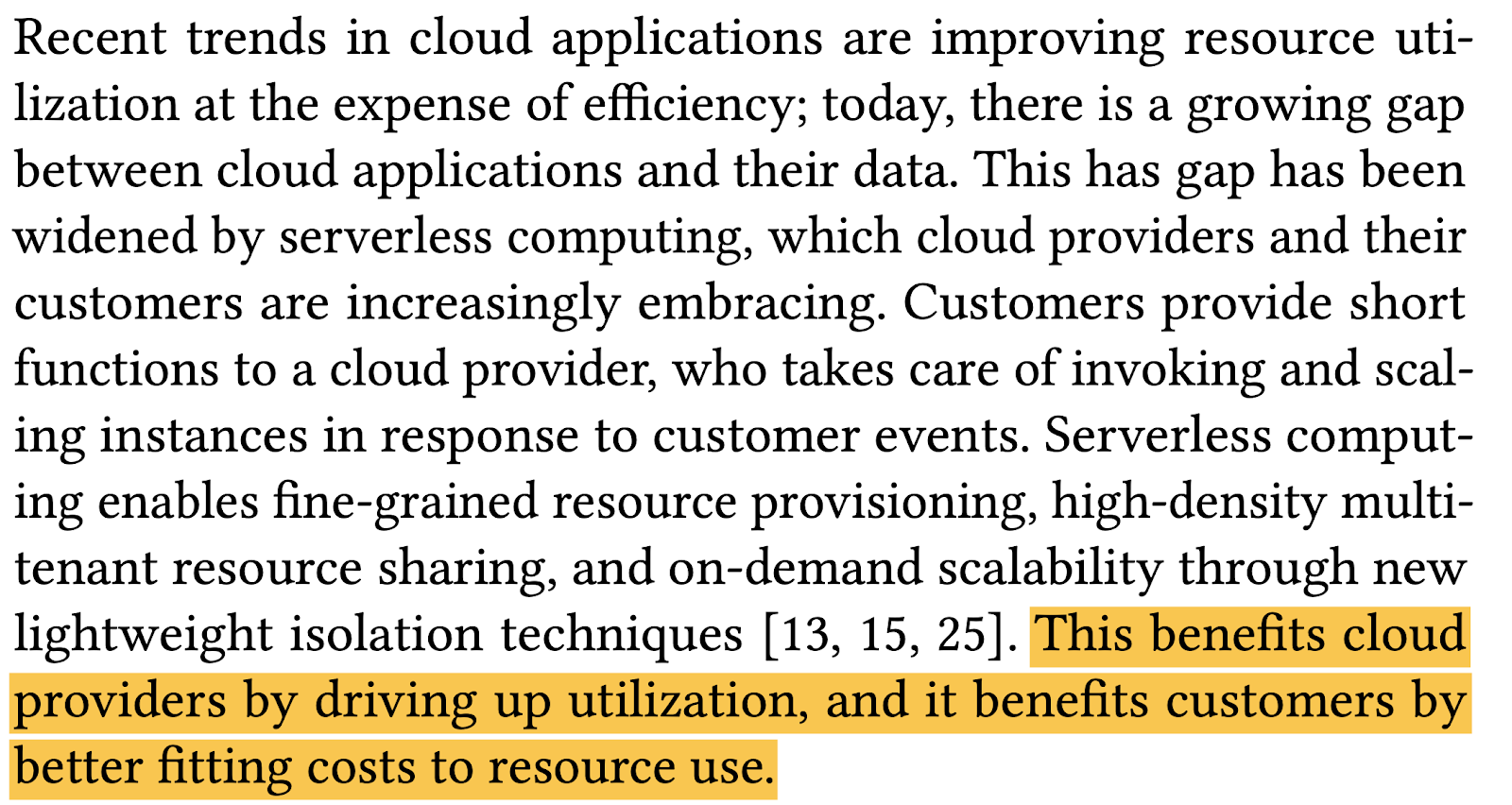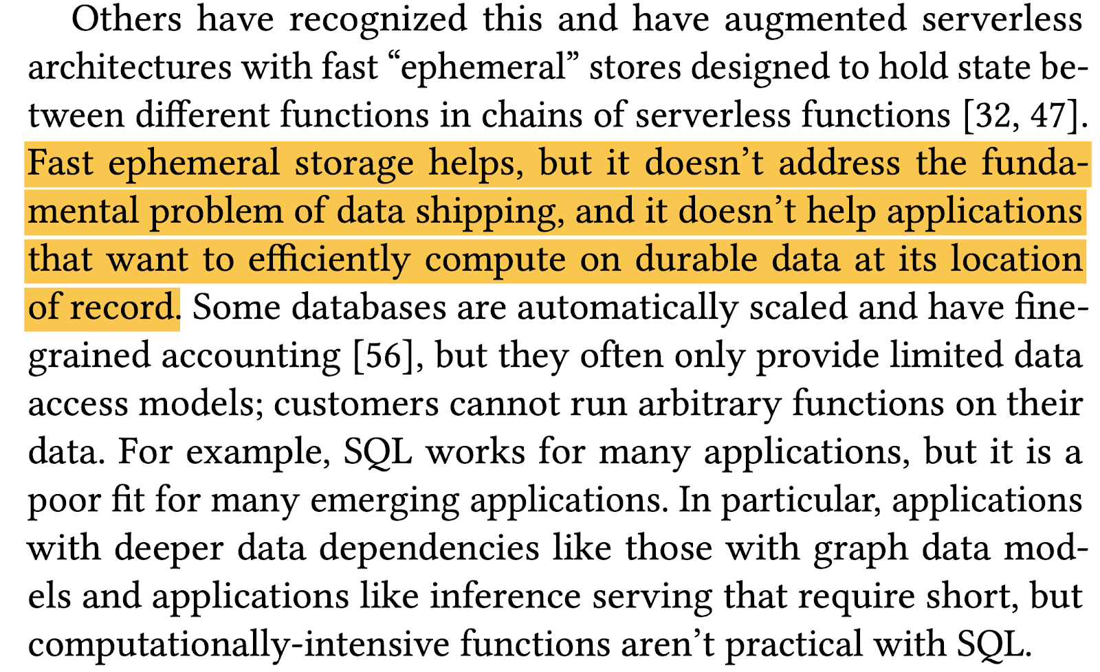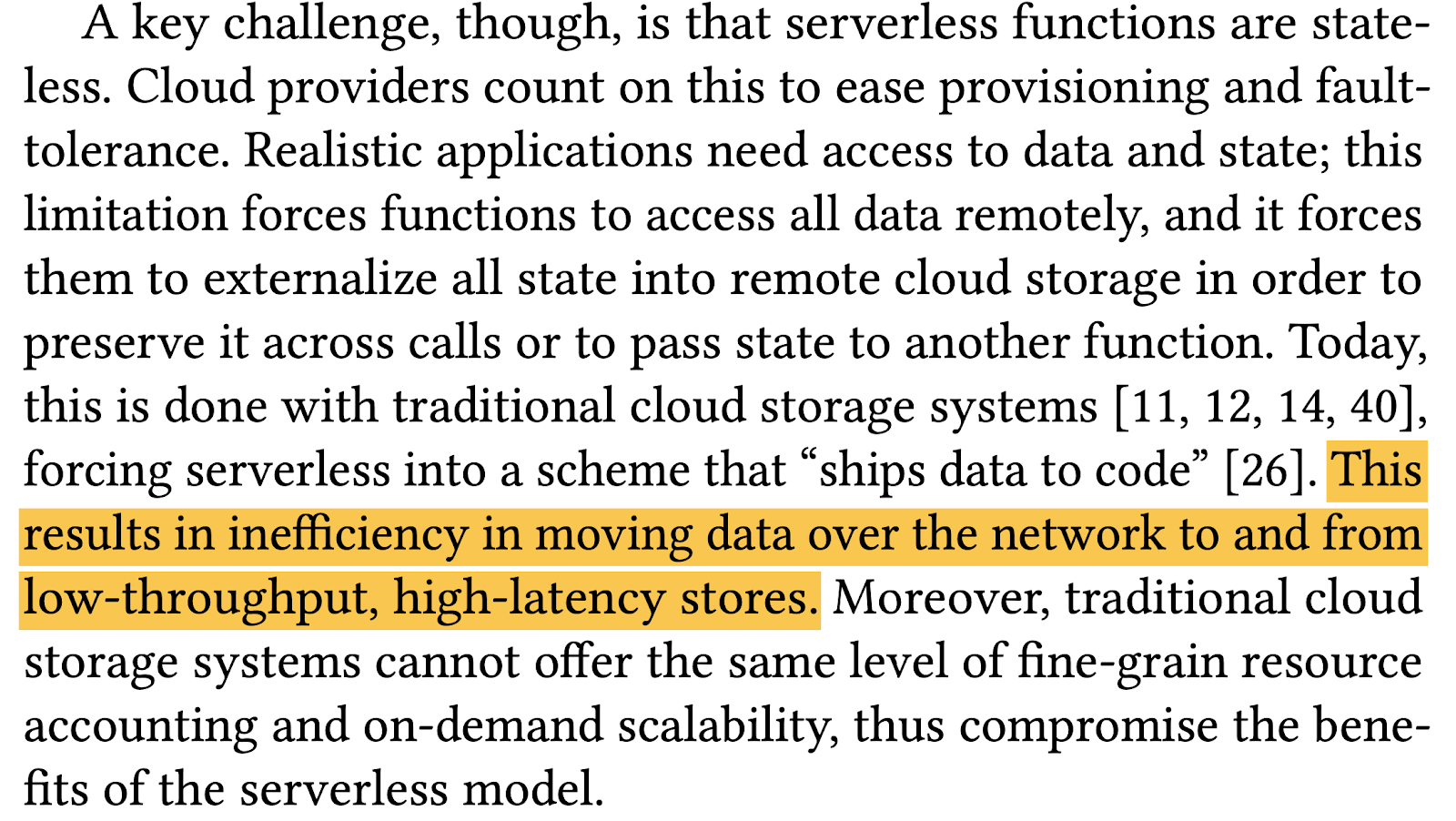 Serverless 은 Stateless 이다. 그래서 function 끼리 data에 접근할 때는 remote 하게 접근을 해야 한다. 이걸 ship data to code라고 부르는데, 이건 비효율적이다. 왜냐면 network를 사용하여 data를 옮겨야 한다. To and from 출력이 낮고, latency가 높은 store에서 말이다.