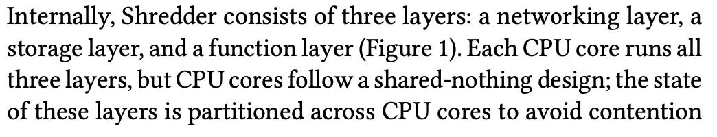 각각의 모든 CPU는 위의 3가지 Layer를 다 쓰지만 서로 shared-nothing deisgn이라서 contention을 없애준다.