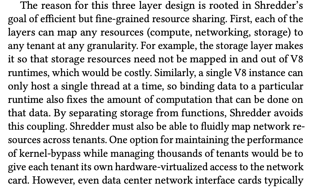 각각의 tenant에게 hardware-virtualized access to the network card를 준다. 그래서 Shredder’s separated network layer takes care multiplexing these resources
