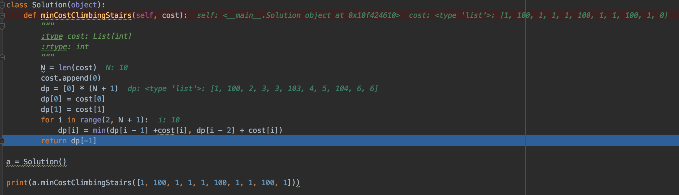 print(a.minCostClimbingStairs([1, 100, 1, 1, 1, 100, 1, 1, 100, 1]))