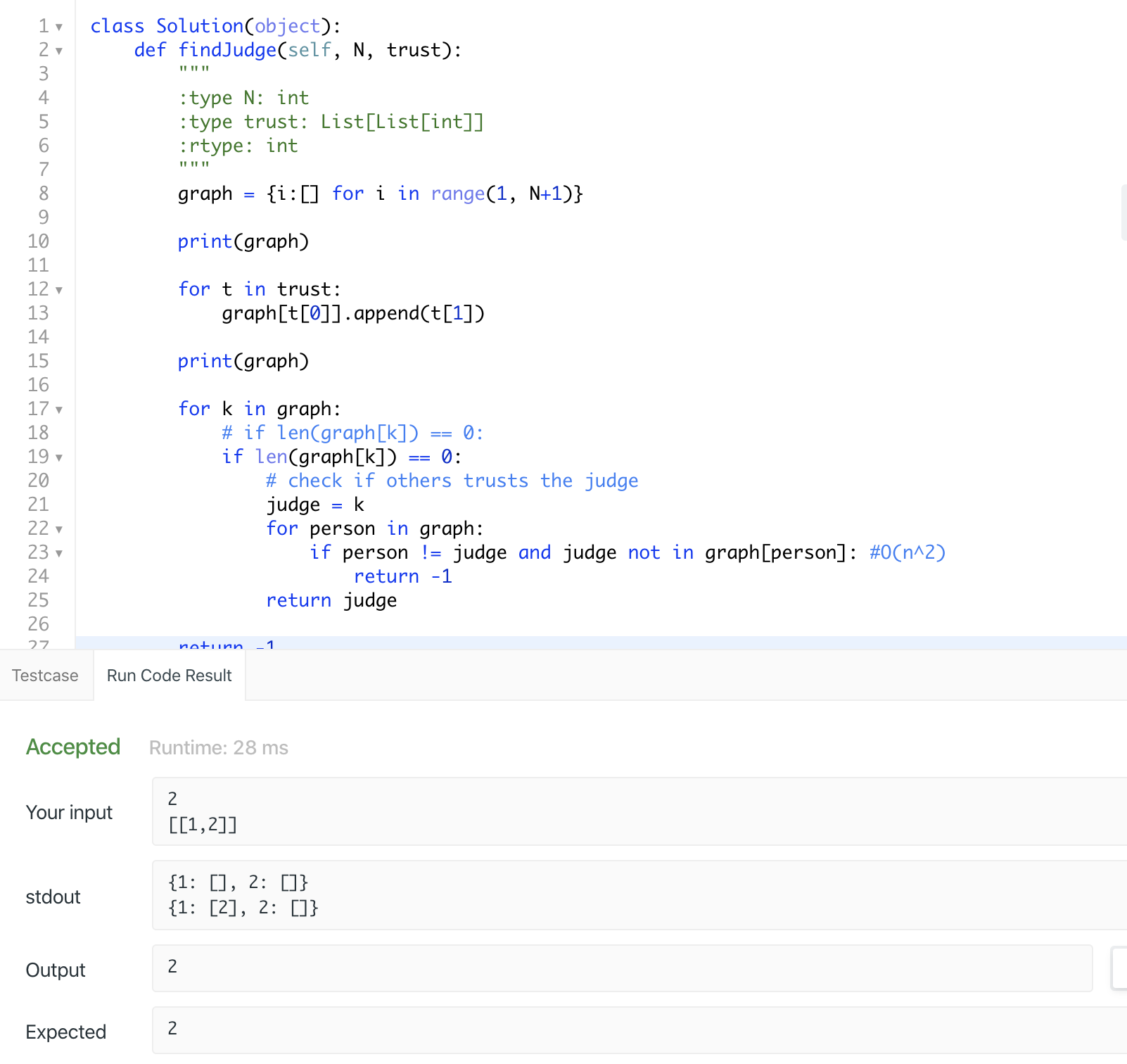 Input: N = 3, trust = [[1,3],[2,3]]