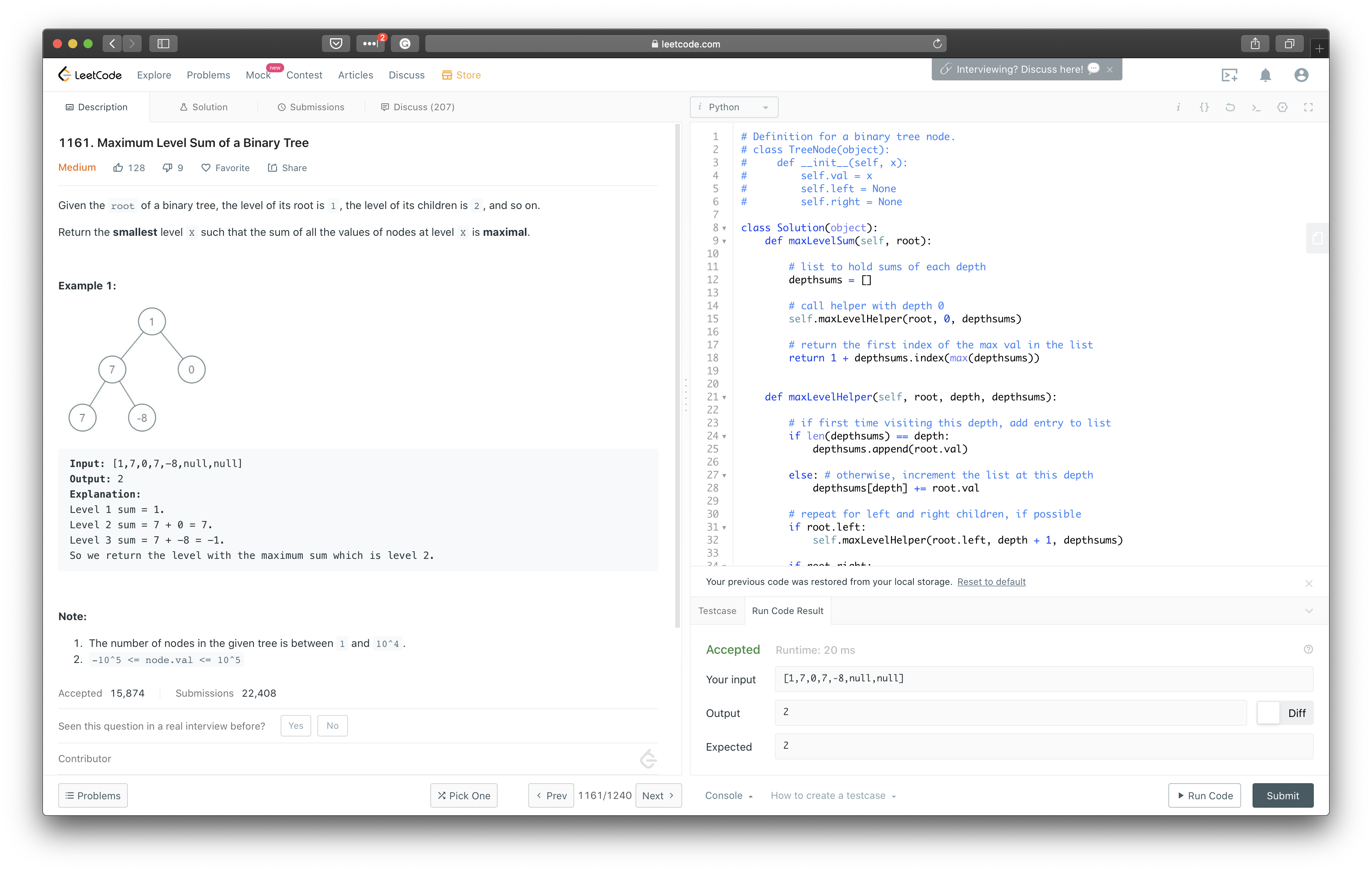 Input: [1,7,0,7,-8,null,null] Output: 2 Explanation: Level 1 sum = 1. Level 2 sum = 7 + 0 = 7. Level 3 sum = 7 + -8 = -1. So we return the level with the maximum sum which is level 2.