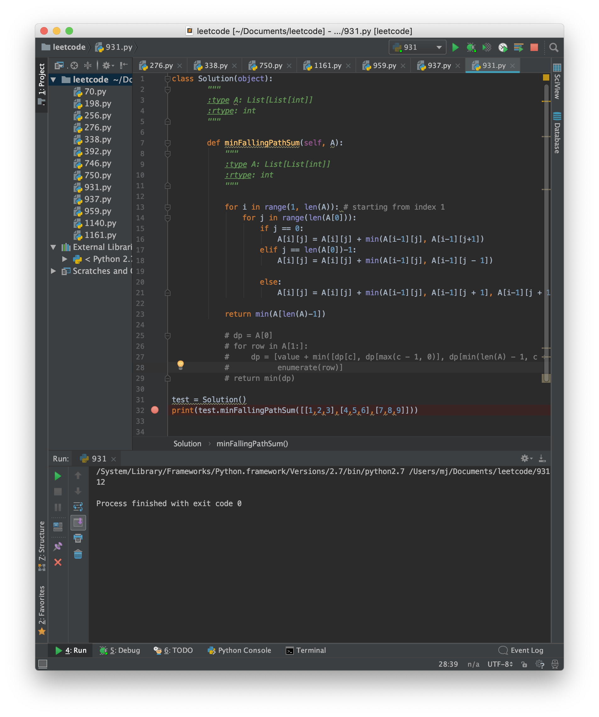 Input: [[1,2,3],[4,5,6],[7,8,9]] Output: 12 Explanation: The possible falling paths are: