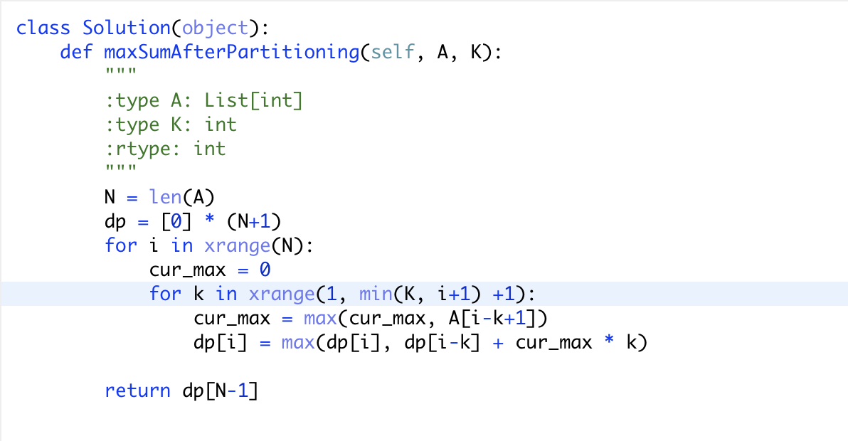Given an integer array A, you partition the array into (contiguous) subarrays of length at most K. After partitioning, each subarray has its values changed to become the maximum value of that subarray.