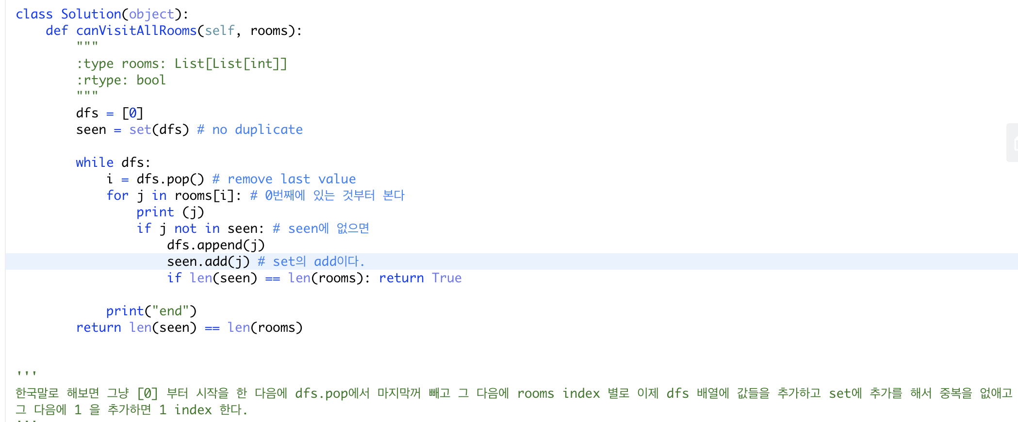 Input: [[1], [2], [3], []] Output: true Explanation: We start in room 0, and pick up key 1. We then go to room 1, and pick up key 2. We then go to room 2, and pick up key 3. We then go to room 3. Since we were able to go to every room, we return true.